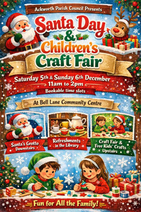 The Parish Council is pleased to announce that our Santa Day will be held over two days this year and will include a Craft Fair, free craft activity for all children, a walk-about magician and festive refreshments in Ackworth Community Library.
